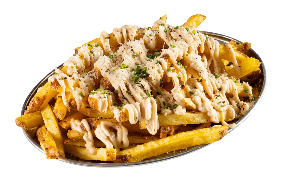 Patatas fritas hand made con piel, cubiertas de salsa de trufa, parmesano rallado, toque de pimienta negra y cebollino.